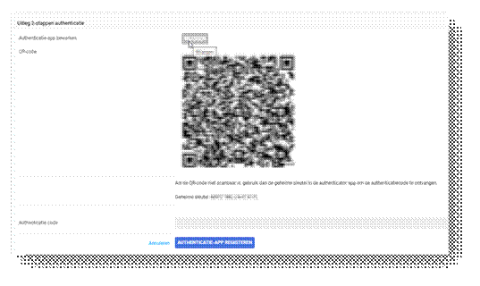 Scan de QR-code op het beeldscherm met de scanoptie in je authenticatie app en vul de getoonde authenticatiecode in het lege veld in. Klik vervolgens op ‘Authenticatie app registreren’. Je authenticatie app is nu gekoppeld.