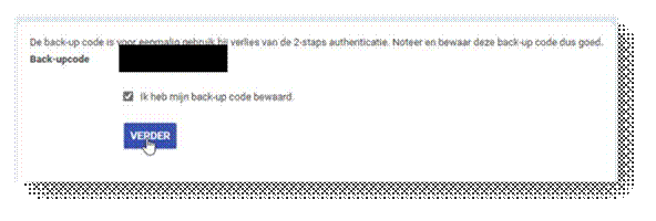Het volgende scherm opent nu, bewaar de nieuwe back-upcode die nu zichtbaar is, zet een vinkje bij Ik heb mijn back-upcode bewaard en klik op verder.