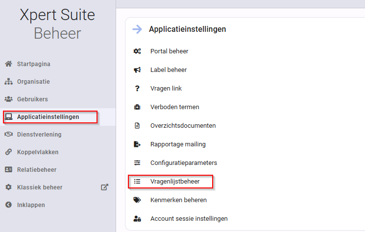 Via beheer > applicatieinstellingen is het vragenlijstbeheer toegankelijk.