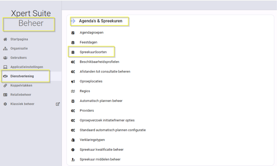 1. Ga naar Beheer > Dienstverlening > Agenda’s en Spreekuren > Spreekuursoorten.